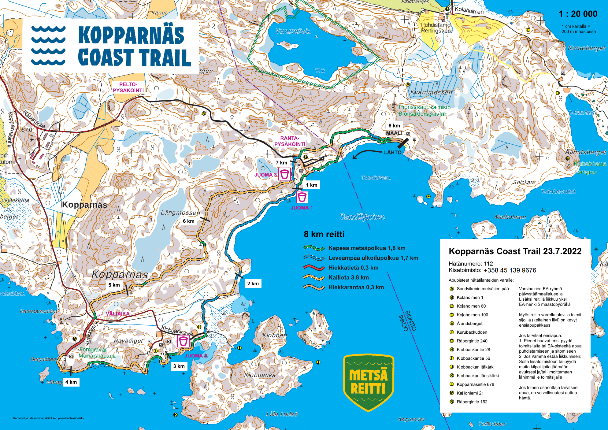 20 km reitti. Katso alempaa pelkästään 8 km:n reitin sisältävä kartta.