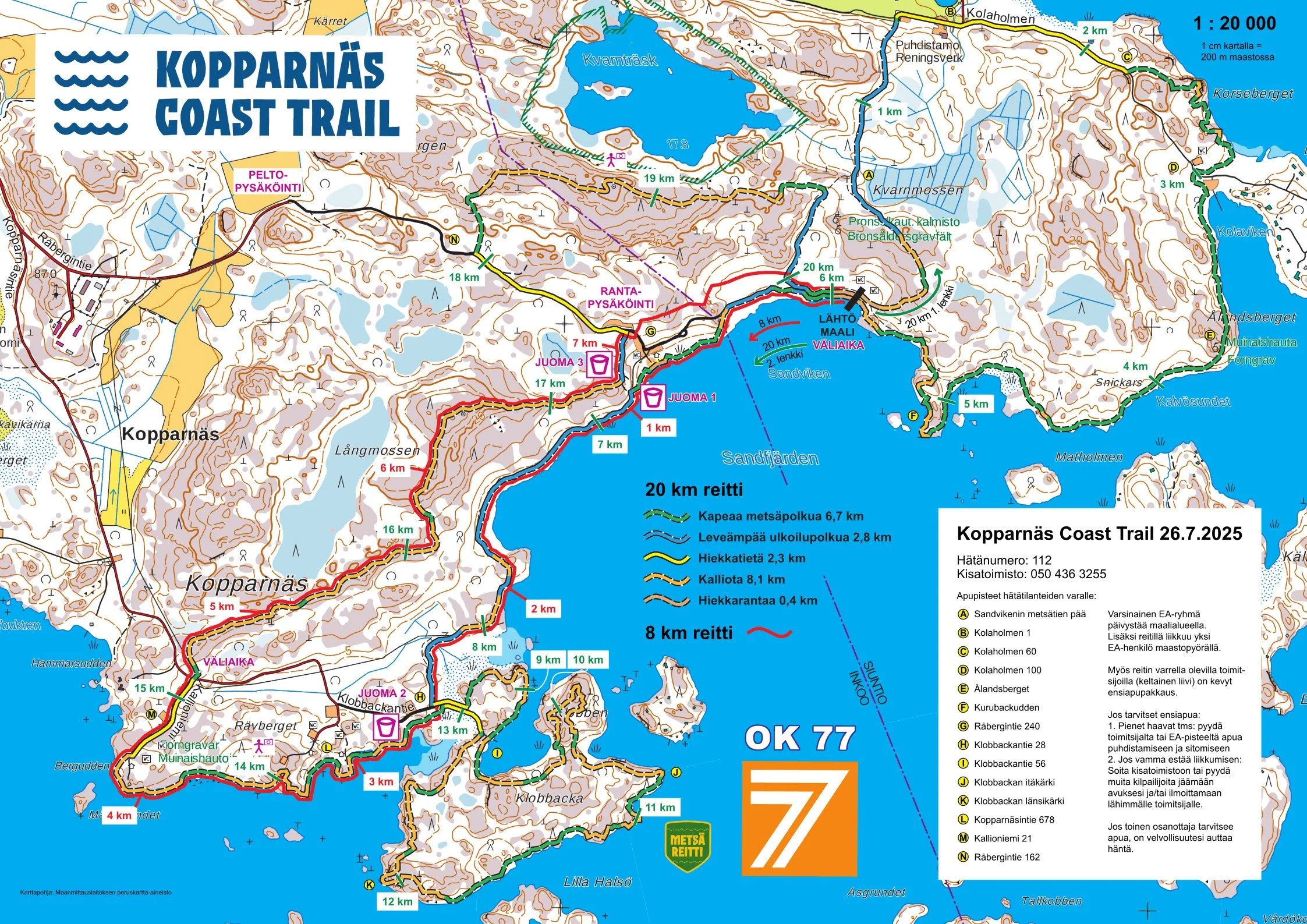 Karttaan merkitty sekä 20 km että 8 km reitit.
